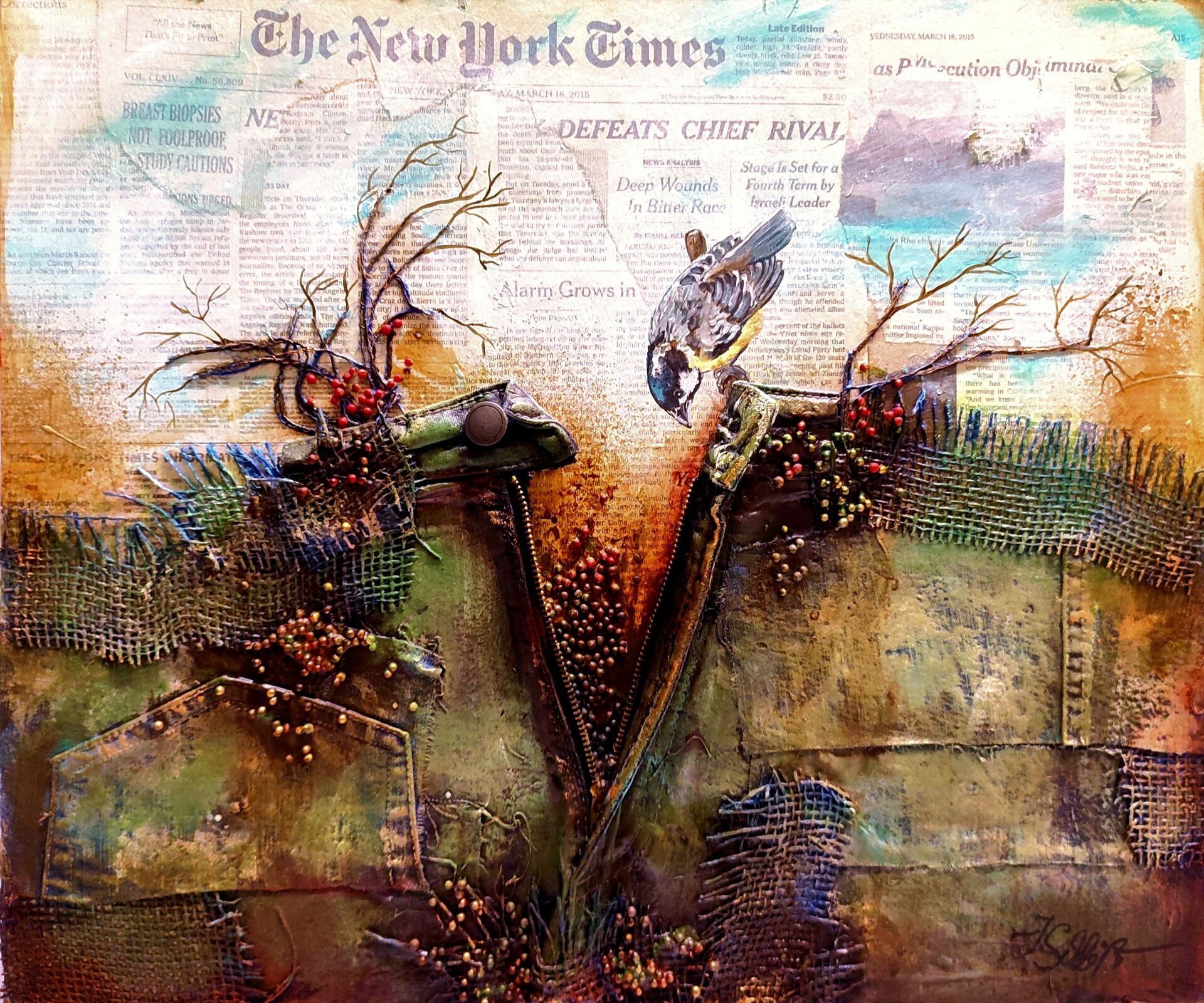 mit Zeitung und Stoffresten (diese zwei Materialien